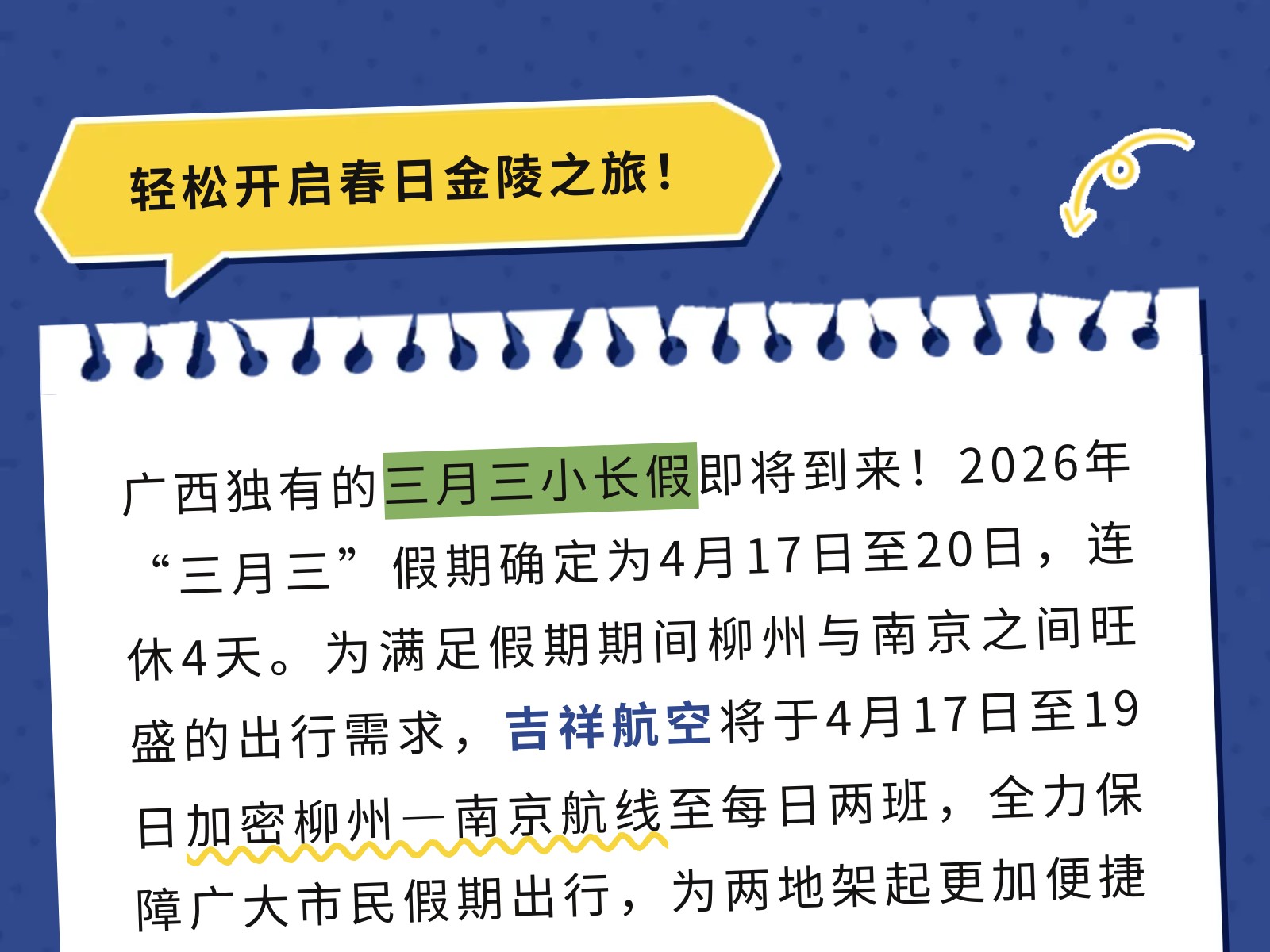 柳州?南京,每天兩班!三月三假期飛赴金陵正當(dāng)時(shí) 發(fā)布時(shí)間:2026年04月10日 10時(shí)來源:本站原創(chuàng)瀏覽:3 人次