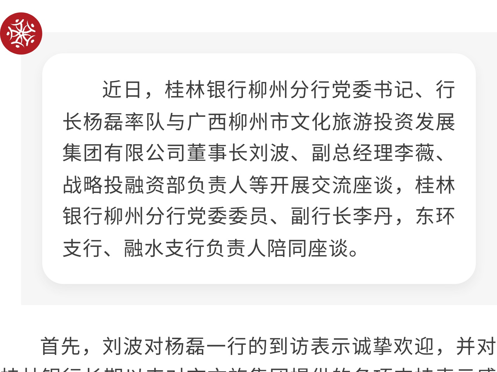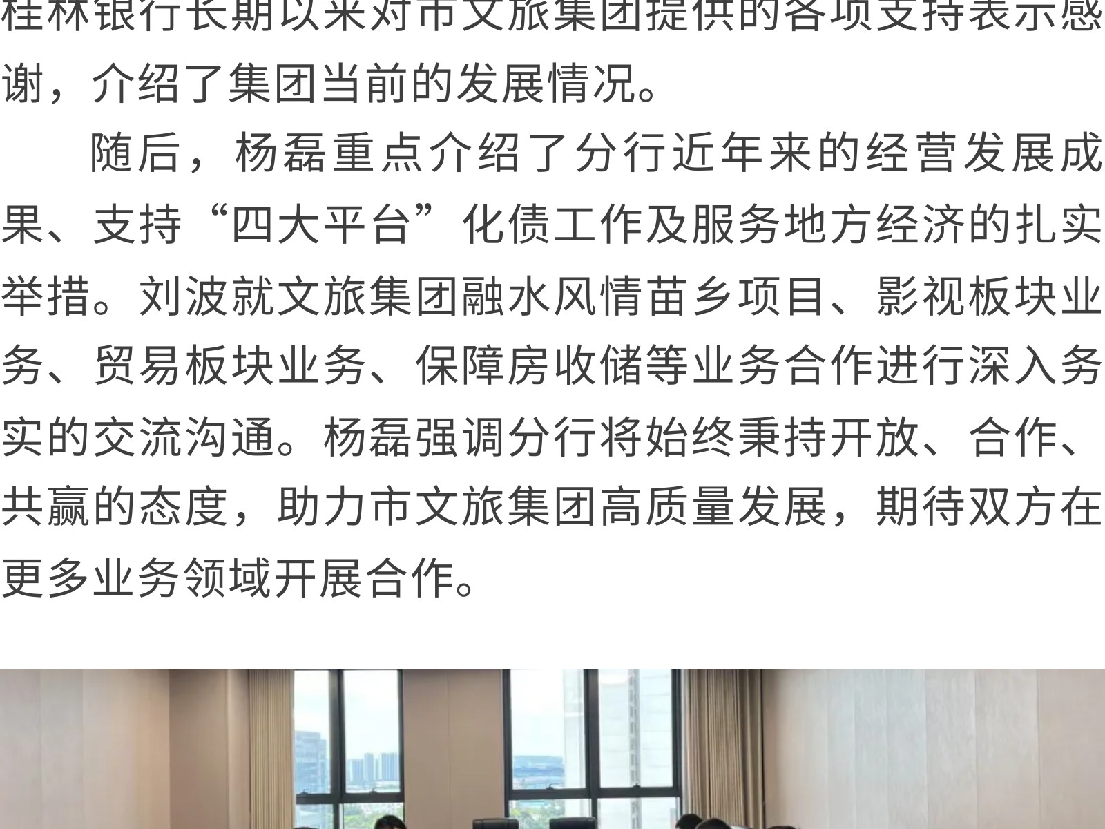 桂林銀行柳州分行到市文旅集團(tuán)開展交流座談 發(fā)布時(shí)間:2025年11月28日 09時(shí)來(lái)源:本站原創(chuàng)瀏覽:11 人次