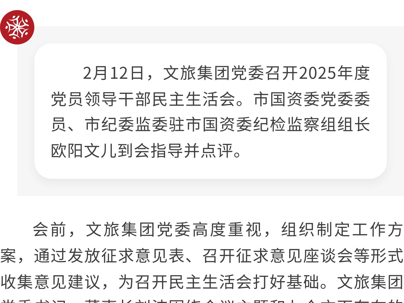 【黨建引領(lǐng)】文旅集團(tuán)黨委召開2025年度黨員領(lǐng)導(dǎo)干部民主生活會 發(fā)布時間:2026年02月12日 13時來源:本站原創(chuàng)瀏覽:48 人次