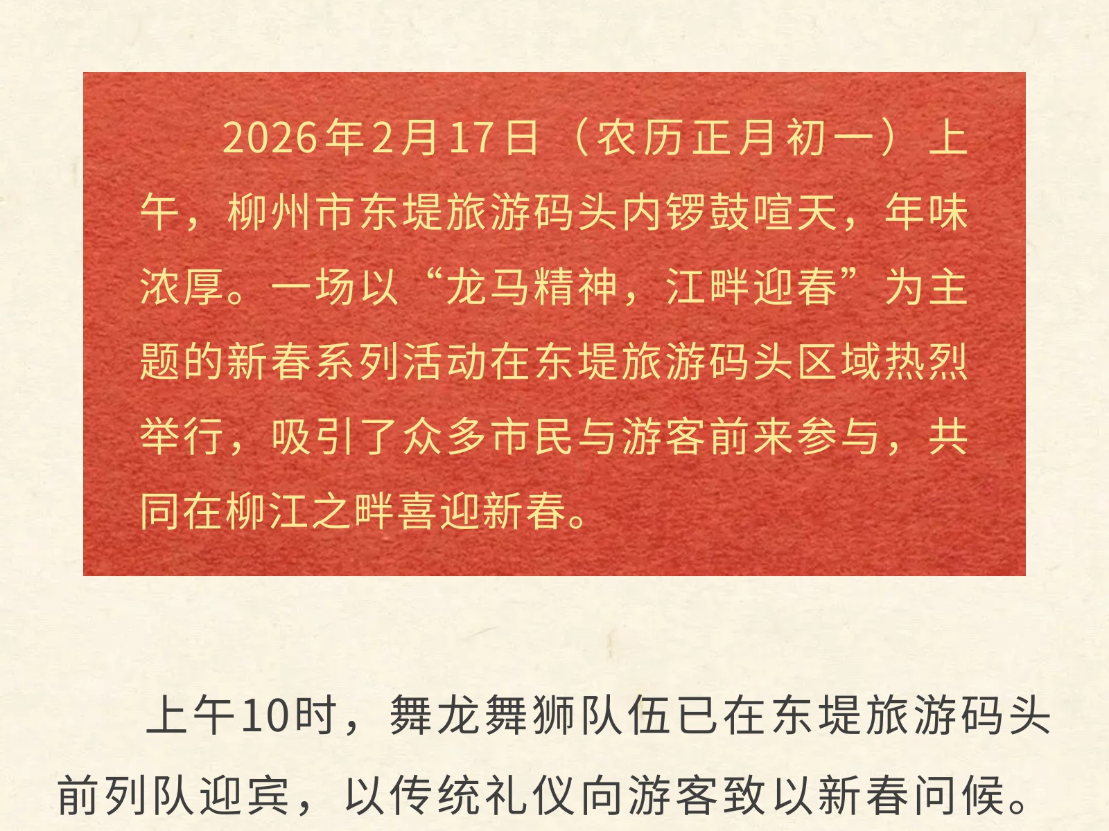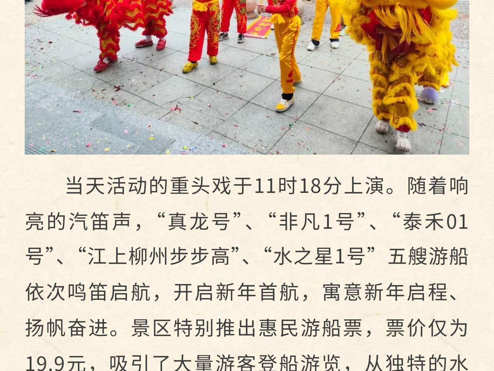百里柳江景區(qū)“龍馬精神”迎新春,正月初一五船齊發(fā)迎客來(lái) 發(fā)布時(shí)間:2026年02月17日 13時(shí)來(lái)源:本站原創(chuàng)瀏覽:44 人次