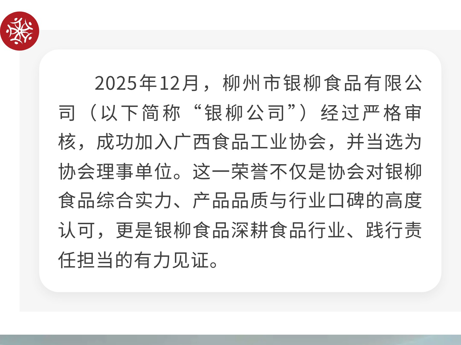凝心聚力啟新程、勇?lián)姑蛭磥怼菔秀y柳食品有限公司當(dāng)選廣西食品工業(yè)協(xié)會理事單位 發(fā)布時間:2026年02月25日 15時來源:本站原創(chuàng)瀏覽:49 人次